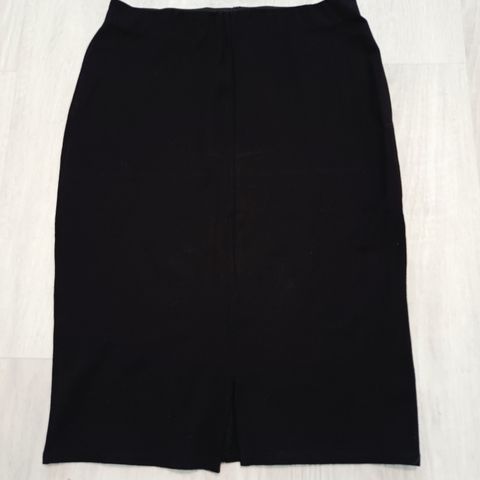 Pitkä hame, jossa vyötäröllä nauhakiristys (kuva 2). Helmassa toisella sivulla halkio (kuva 3). Joustava ja miellyttävä puuvillatrikoo kangas. Hameen pituus vyötäröltä 97 cm. Kokomerkintä 38/40.