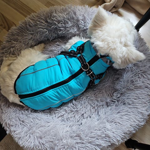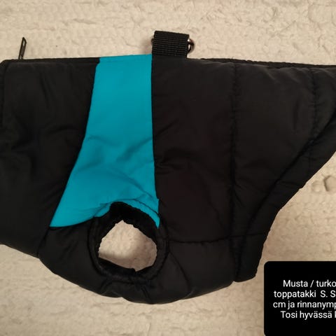 Hyväkuntoinen ja kaunis kolmivärinen toppatakki pienelle koiralle.