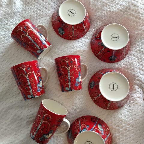 Taika mukit 6 kpl, kulho 1 kpl, kermakko 1 kpl. Kaikki tuotteet virheettömiä. Voidaan myydä erikseen.
