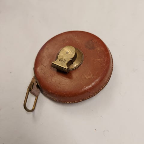Vintage, nahkainen 20 metrin mitta. Kelaussysteemi toimii hyvin. Myynnissä myös muualla.