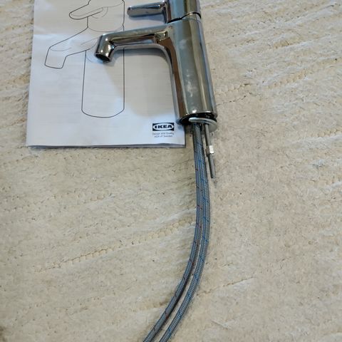 Täysin käyttämätön Ikean Svenskär hana. Pakkaus sisältää hanan, liitäntäletkut ja asennustarvikkeita. Hanan vivussa kuuma- ja kylmävesimerkinnät.