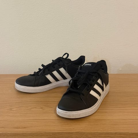 Grand Court K eli "Camo"-mallin Adidaksen mustat junior-tennarit mustilla radoilla. Kokeiltu pari kertaa, hieman kapea malli aikuiseen jalkaan. Vuosimallia 2021. MMM.