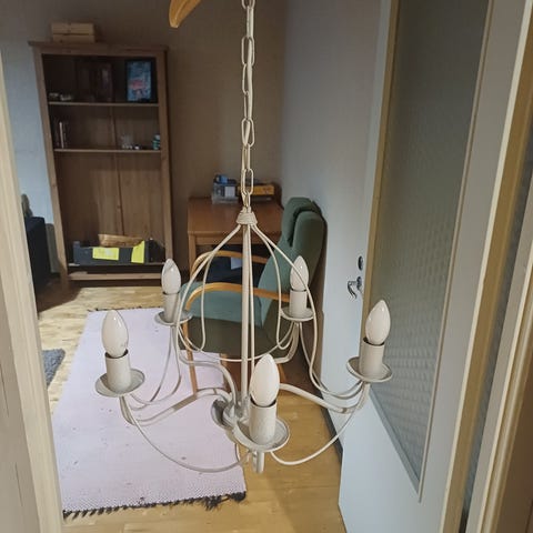 Muovia, toimiva, helmet tallella mutta yksi "koukku/ripustin" puuttuu, helppo korvata ja roikkuvan osan saa takaisin paikalleen. Lamput eivät kuulu kauppaan ellei niin sovita erikseen. Vain nouto, en muista mistä ostettu merkki ei ole ikea.
