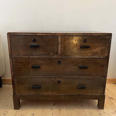 Lipasto (2 kpl) sekä irrallinen taso päälle, jossa on yhteensä kuusi laatikkoa ja pyöreät retro vetimet. Väri on maalattu valkoinen ja muotoilu on yksinkertainen ja suoraviivainen. Lipastossa on havaittavissa kulumisen merkkejä, kuten naarmuja ja pinnoitteen irtoamista etupaneeleissa.