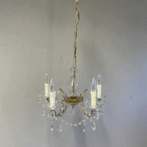 Kattokruunu, jossa on viisi lasikupua ja koristeelliset metalliosat. Valaisimessa on rokokoo-tyylisiä messinkisiä yksityiskohtia ja se on suunniteltu roikkumaan katosta.