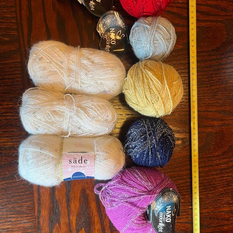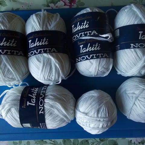 Novita teddy vaalea beige 100g, oranssia samantyylistä lankaa 212g. Oranssin merkistä ei tietoa.