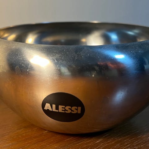 Alessi kulho ruostumattomasta teräksestä, hopeanvärinen. Pyöreä, sileäreunainen kulho, jonka halkaisija on n 20cm. Sopii esimerkiksi tarjoilukulhoksi tai hedelmäkulhoksi keittiöön tai ruokailutilaan. Nouto Turku-Naantali tai postitus. Käytönjälkiä näkyy.