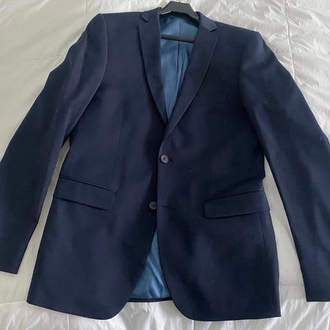 Dressman tummansininen miesten puku slim fit. Pari kertaa käytetty. Mukana myös paita ja kravatti, eli kokonainen paketti valmiina juhliin.