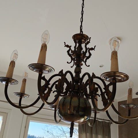 Myydään näyttävä ja tyylikäs vanha messinkinen kattokruunu, jossa on kahdeksan valonlähdettä. Valaisin on hyväkuntoinen ja täysin käyttövalmis. Kaunis patinoitunut messinkipinta antaa sille arvokkaan, klassisen ilmeen. Kynttiläholkit ehjät.