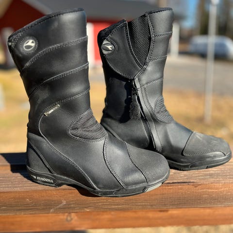 Kestävää nahkaa, kulutettu ruskea viimeistely. Vahvistetut kanta- ja varvaskupit. Pehmeät suojat nilkan kohdalla. Vedenpitävä kalvo. Pehmustettu pohjallinen. Kuvioitu kumipohja.