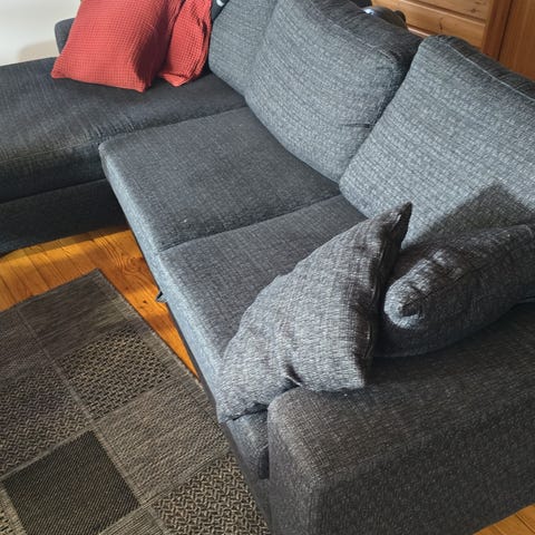 Säädettävä vuodesohva. Korkeus 40 cm lattialta, pituus 170-185 cm. Jalusta, patja, 2 tyynyä.