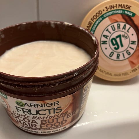 Garnier Fructis Curls Restoring Cocoa Butter Hair Food hiusnaamio. Tuote on suunniteltu erityisesti kiharoille ja kuiville hiuksille. Naamio sisältää kaakaovoita ja sen koostumus on 97 % luonnollista alkuperää olevista ainesosista. Pakkauskoko 400 ml. Voidaan käyttää 3-in-1-tuotteena: hoitoaineena, hiusnaamiona tai ennen shampoopesua valmistajan ohjeiden mukaan. Tuoksu ihanan makea.