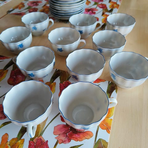 Malli on sama kuin esim. Valencia tai Katrilli kupeissa, mutta koristelematon ja leimaamaton. Kupin kork. 6,5 cm, halk.9,5, asetin halk. 14 cm, kunto mint.