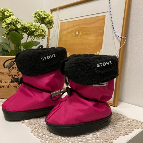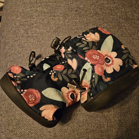 Myydään kukalliset Stonz kengät / töppöset, joissa on fleecevuori sekä niihin sopivat irroitettavat sisävuoret. Molempien koko on Large. Kengissä on kiristysnyörit ja ovat pestyt. Siistikuntoiset, mutta kuten kuvista näkee niin mm merkki on kulunut kengän takaa ja yhdestä sisävuoren merkin reunasta.