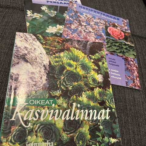 Ilmoituksessa on useita viherkasveja ruukuissa. Ensimmäisessä ja toisessa kuvassa näkyy köynnöstäviä viherkasveja, joissa on vihreitä ja kirjavia lehtiä. Kolmannessa kuvassa on pysty, tummanvihreälehtinen viherkasvi. Kasvit sopivat sisätilojen yleisiksi huonekasveiksi. Ruukut sisältyvät mukaan.Kaikki 3kpl.Mielellään pikainen nouto.