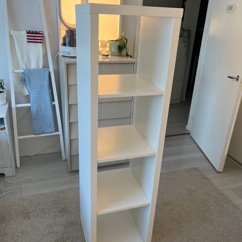IKEA Kallax hyllykkö, jossa 8 neliönmuotoista lokeroa. Väri musta. Mitat: leveys 76,5 cm, syvyys 39 cm ja korkeus 146,5 cm. Enimmäiskuormitus per hyllylevy 13 kg. Sopii esimerkiksi kirjojen, säilytyskorien tai koriste-esineiden säilytykseen. Kuvissa näkyy käytön jälkiä ja kulumaa alaosassa ja sivuissa.