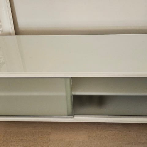 Hyväkuntoinen, tukeva valkoinen tv-taso. Tasossa on pieniä käytön jälkiä siellä täällä, mutta kuten kuvasta näkyy, on yleisilme edelleen siisti. LEveys 145 cm, syvyys 49 cm, korkeus 45 cm.