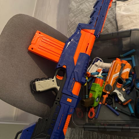 Kolme Nerf asetta. Yhden aseen paristo luukku kadonnut, muutoin hyvä kuntoiset. Vaatii panokset erikseen.