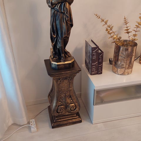 Jalustan korkeus 85 cm. Patsaan korkeus 81 cm. Kokonaiskorkeus siis 166 cm.
