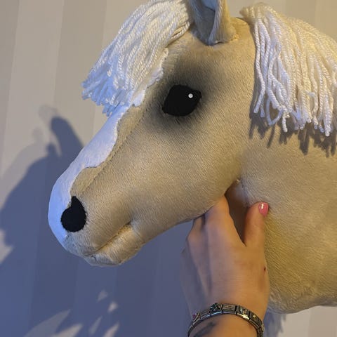 Hevonen valmistettu velboasta tukikankaan avulla, harja perus villalankaa.