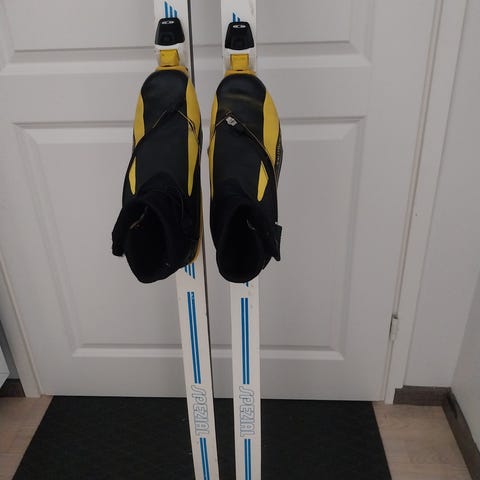 Peltonen Acadia 209 cm perinteisen hiihtotavan sukset ja Fischerin koon 45 monot.