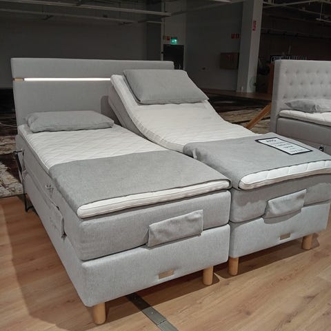 Nyt poistohintaan myytävään Comfort -moottorisängyn hintaan sisältyvät myös laadukas kotimainen HS45 160x200 -sijauspatja halkiolla, sekä verhoiltu sängynpääty napeilla.