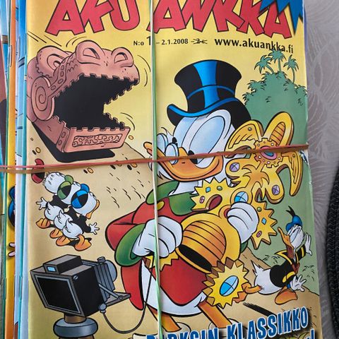 Yhtenä pakettina Aku Ankka sarjakuvalehtiä vuosilta 2007-2017 yht. 96 kpl. Vuodelta 2007 22 kpl. Vuodelta 2008 22 kpl. Vuodelta 2009 1 kpl ja 2010 1 kpl. Vuodelta 2012 15 kpl. Vuodelta 2013 22 kpl. Vuodelta 2014 1 kpl, 2015 3 kpl, 2016 1 kpl ja vuodelta 2017 8 kpl. Yhteensä 4 euroa, nouto Myllypuro, mobilepay ei käy. Tarvittaessa voin tuoda Myllypuron metroasemalle.