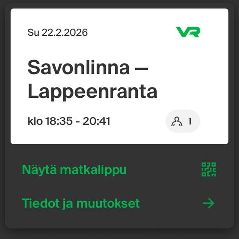 Kahden aikuisen meno Lappeenranta-Kouvola ylihuomenna torstaina kuvan mukaiseen aikaan. Paikat pöytäpenkissä yläkerrassa maisemien ihailuun. IC8.