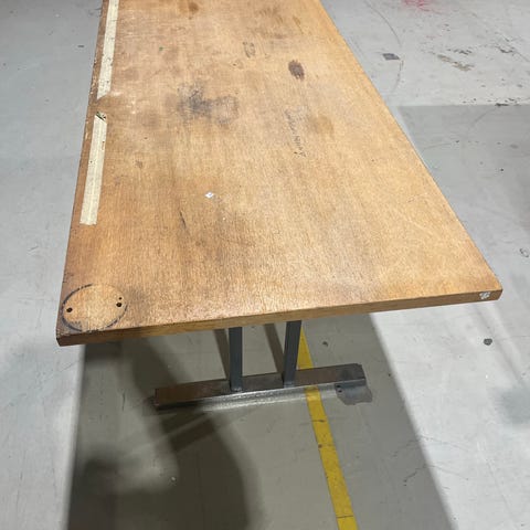 Metallirunkoinen työpöytä, jossa tummasta levystä valmistettu työtaso ja alempi hylly. Pöydässä on kulmikas runkorakenne ja useita jalkoja, jotka voidaan kiinnittää lattiaan ruuveilla tai pulteilla. Soveltuu esimerkiksi varastoon, työpajaan tai tuotantotilaan työskentely- ja säilytyspisteeksi. Rungon materiaali on metallia ja tasot ovat puupohjaista levyä.