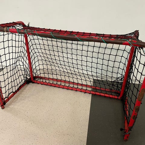 Siirreltävä jääkiekko tai sählymaali, jossa on metallinen runko ja verkko. Mitat ovat noin 130 cm leveys ja 100 cm korkeus. Maali on suunniteltu ulkokäyttöön.