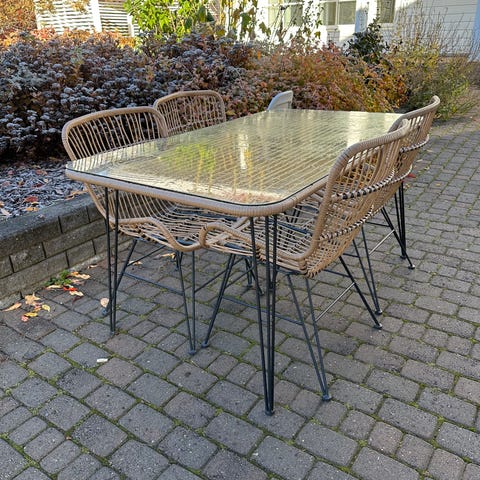 Pyöreä sohvapöytä ja kolme rahia. Materiaali jonkinlaista muovia. Pöydässä on lasikansi. Sekä pöytä että rahit ovat vaaleaa sävyä. Rahien päällä on irralliset, vaaleat istuintyynyt. Kuvissa hieman likaiset mutta pesemällä puhdistuu.