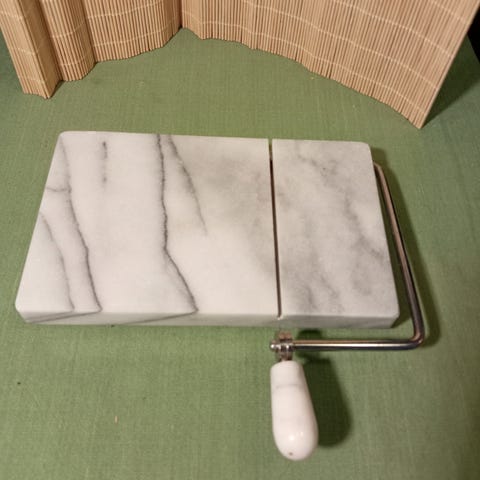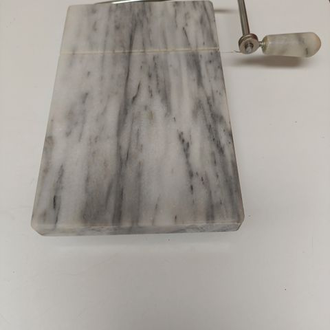 Juustoleikkuri, jossa on marmorialusta ja metallinen leikkauslanka. Alustan pinta on tummanharmaa ja siinä on mustia kuvioita.