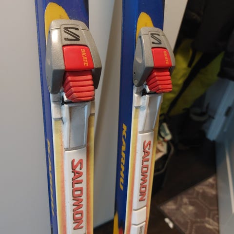 Käytetyt mutta hyvässä kunnossa olevat Atomicin sukset sekä Salomonin monot.