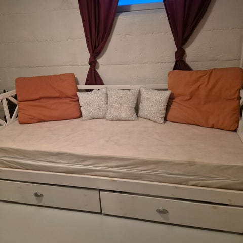 Sohvatyynyjen takana pientä likaa, lähtee luultavammin pesulla. Sohvan takana pieni paikkaus (vika kuva).