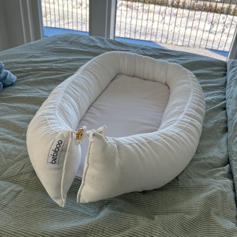 Sleepyhead deluxe vauvan unipesä, väri valkoinen. Pehmeäreunainen pesä vastasyntyneelle tai pienelle vauvalle. Soveltuu käytettäväksi esimerkiksi sängyssä tai sohvalla aikuisen valvonnassa. Päällisessä on pieniä jälkiä (vähän keltaisuutta mutta lähtisi varmaan pois tahranpoistoaineella).