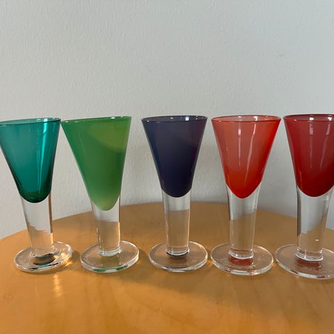 Pekka Paunilan suunnittelemat lasipuhalletut snapsilasit. Väreinä sinisen, liilan ja mustan sävyjä. Snapsilasit ovat signeerattuja, 1kpl 95 ja 10kpl 01. Lasien korkeus n. 10,7 cm.