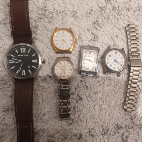 Yhteispakettina 5kpl miesten vintage kelloja. Kelloista käy parhaillaan vain Leijona. Muut patterikellot Armani exchange, Seiko ja Pca tank tarvitsevat ainakin uuden patterin eikä ole testattu toimivuutta. Mukana myös vintage Anker 17 rubis skindiver. Se ei käy ja vaatii jotain korjausta. Siinä takakansi niin tiukassa että en saanut koneistosta kuvaa. Päällisin puolin on siisti ja taitaa olla alkuperäinen ranneke. Kaikki kellot korjattavaksi tai osiksi ilman sen kummempia takuita.