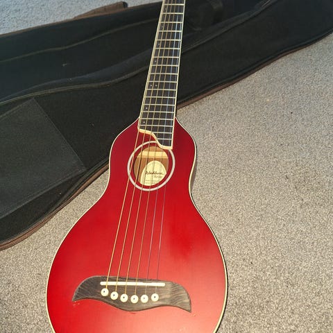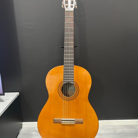 Korjailuja vaativa kitara. Kaksi kieltä puuttuu ja viritystä kaipailee.