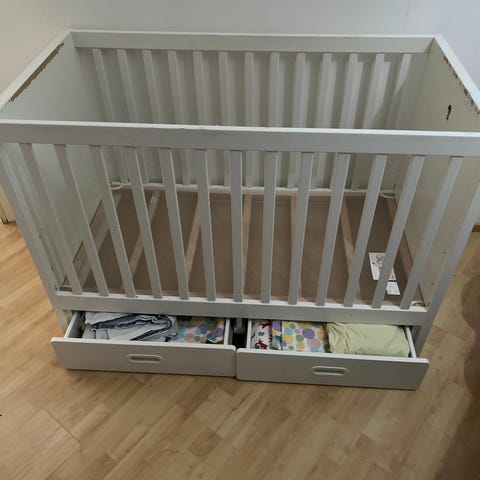 Sängyssä joitain tarroja ja pieniä käytönjälkiä. Yksi ruuvi puuttuu. Muutoin siisti ja käyttökelpoinen! Purettu noutoa varten.