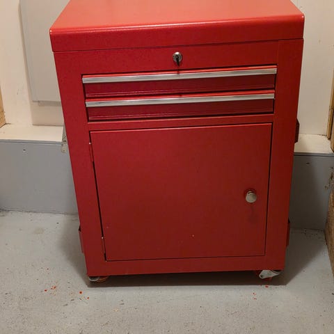 Metallinen työkalukaappi pyörillä jossa laaja valikoima käsityökaluja. Kaapissa on rei’itetyt ovet sekä takaseinä, joihin työkalut on ripustettu. Mukana on muun muassa kiintoavaimia, räikkäväännin ja hylsysarjoja, pihtejä, ruuvimeisseleitä, vasaroita ja tarvikkeita. Sopii esimerkiksi autotalliin tai verstaaseen käsityö- ja huoltotöihin.