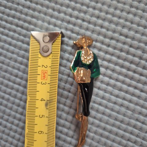 Perhosen muotoinen, siistikuntoinen rintakoru. Siivet punaiset, metalliosat kultaiset.