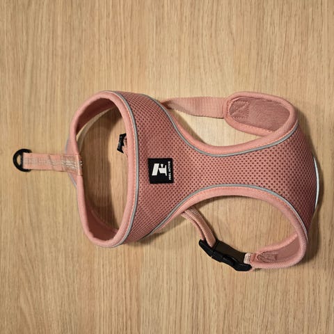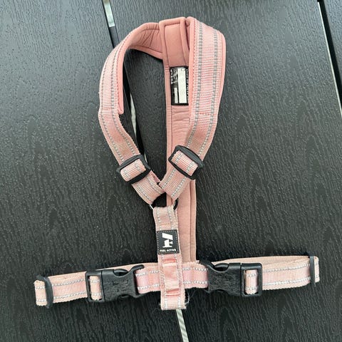 Muutaman kuukauden käytössä olleet valjaat. Hyvässä kunnossa, ainoastaan soljissa pieniä naarmuja. Rinnanympärys 56-69cm.