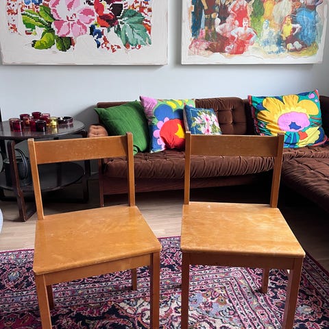 Askon Palermo tuolit - itse laitettu uusi verhoilu (farkunsininen kangas). Puuosat tummanruskea/musta.