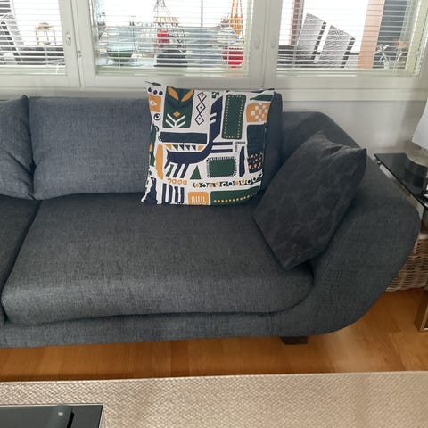 Ei mitään isompia tahroja kankaissa. Tyynyjen päälliset on irrotettavissa ja pestävissä.