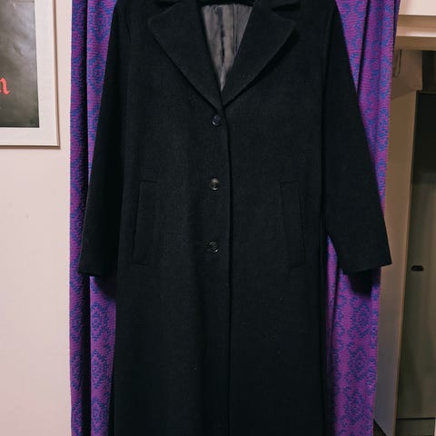 Musta pitkä villakangastakki, jossa nappikiinnitys edessä ja sivutaskut. Hihansuissa koristeelliset tamppiyksityiskohdat ja takana vyötäröllä nappikiinnitteinen tampi. Vuorillinen malli, koko 36, pituus olka-helma 130 cm, olka-olka 42 cm, hiha 46 cm.