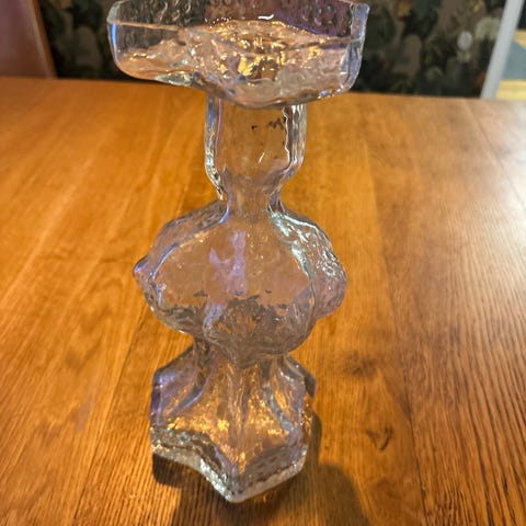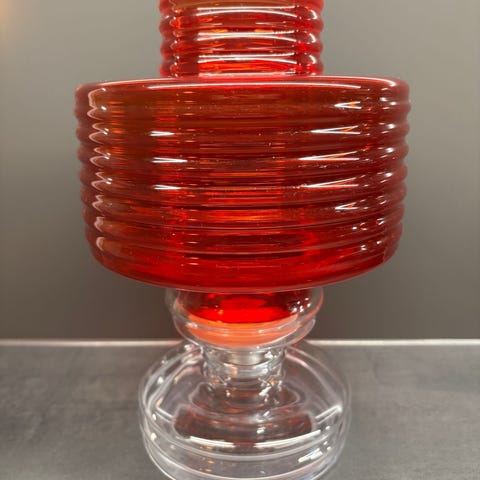 Riihimäen Lasin kynttilälyhty. Korkeus 27 cm halkaisija 17 cm. Yläosassa pieni rikama. Muuten hyväkuntoinen.