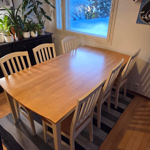 Myydään kuuden hengen hyväkuntoinen valkoinen/puinen ruokailuryhmä.