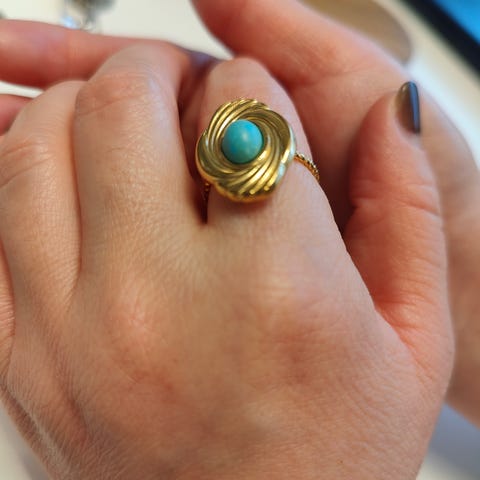 Leggiosta valmistettu kulta-värinen sormus, keskellä on upea turkoosi-kivi.