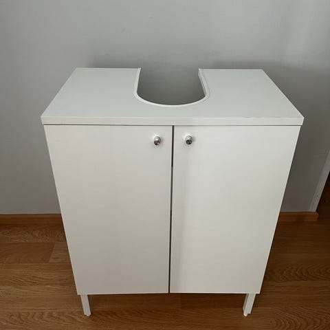 Kylpyhuoneen allaskaappi tummanruskea. Kaapissa on kaksi ovea ja yläosassa aukko pesuallasta tai viemäriputkea varten. Sopii allaskaapiksi kylpyhuoneeseen tai wc-tilaan. Materiaali on puupohjainen kalustemateriaali, jossa tumma viimeistely. Kaappi seisoo jaloilla lattialla ja tarjoaa säilytystilaa pesu- ja siivoustarvikkeille. Pientä käytön jälkeä löytyy, suoraan käytöstä puunaus jää ostajalle