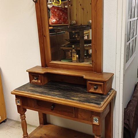 Kuvien vintage kalusteryhmä, missä teak senkki ja peili, plus pöytä. Kuvissa olevat muut tavarat ei kuulu mukaan, mustan nahkapallin saa halutessaan. Vain nouto.